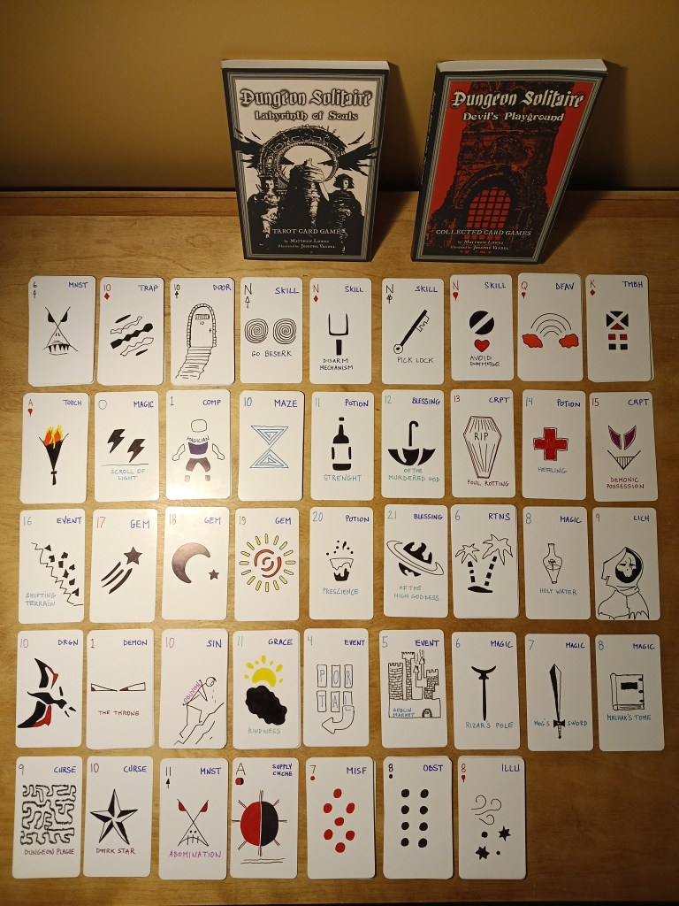 The larger cards come band-wrapped to keep the price down, but tarot-sized boxes are an easy find. If you’re looking for an update to your Dungeon Solitaire games, look no further. I like the new design and may update the poker-sized cards at some point as well. There may also be an Omnibus Rulebook on the horizon.