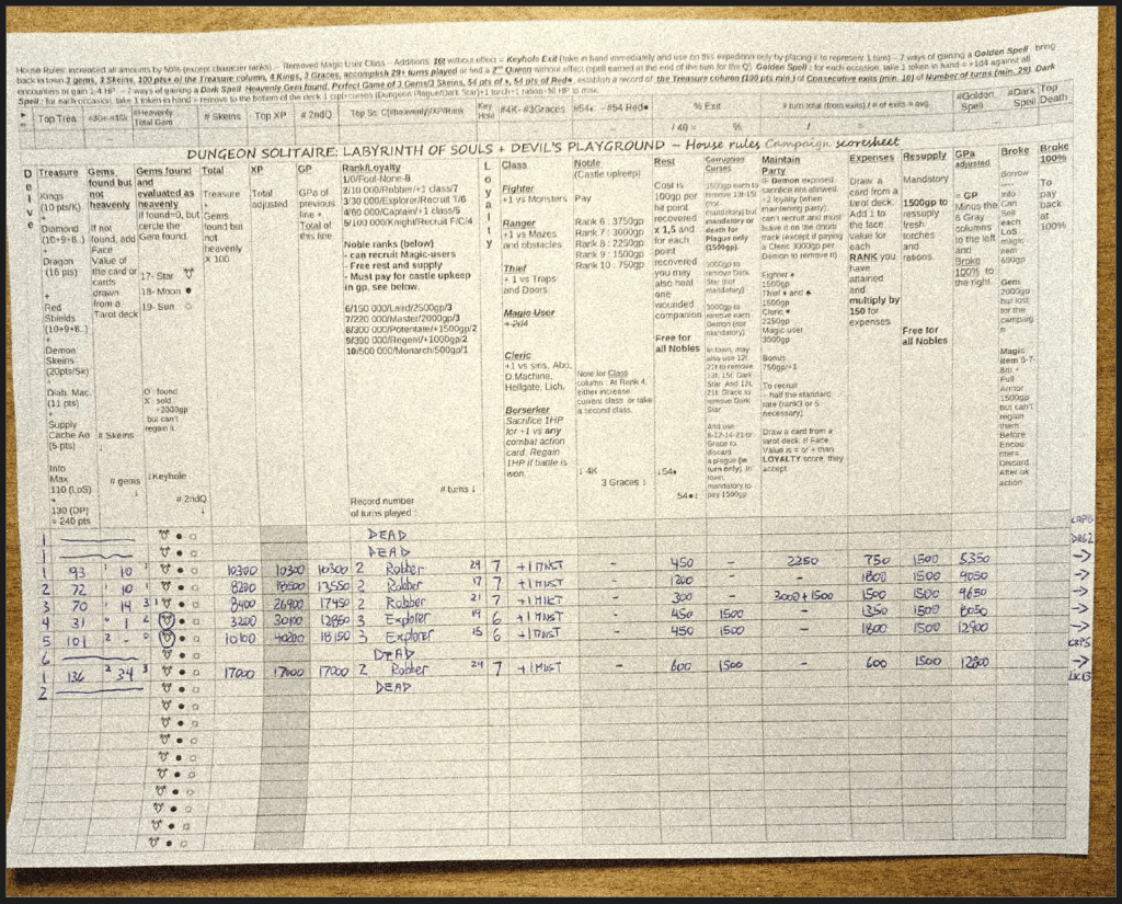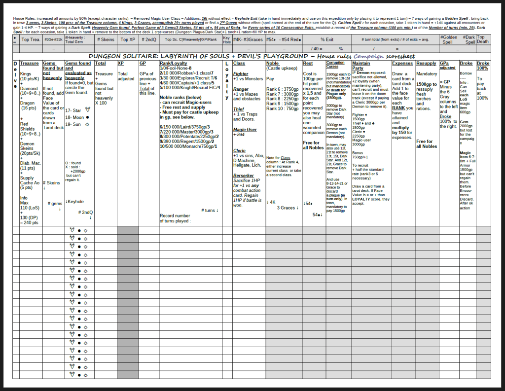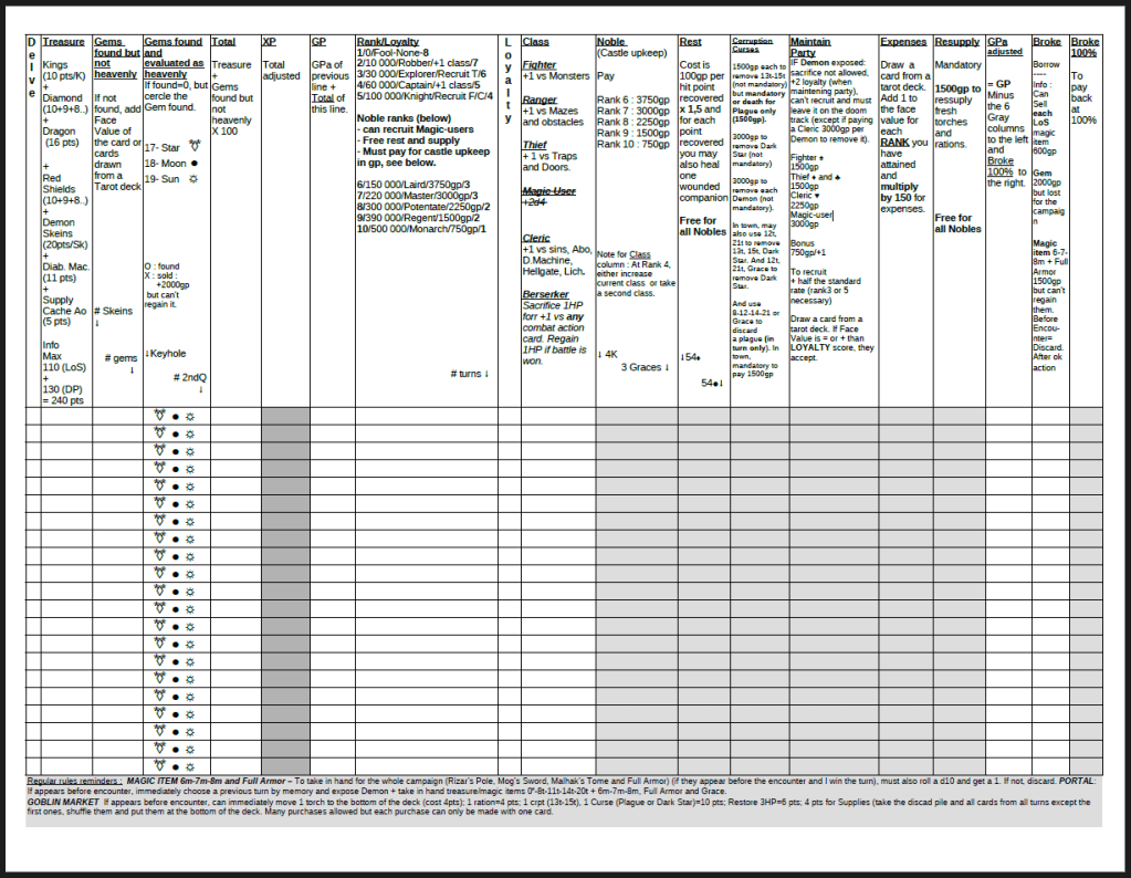 • One tarot deck for drawing in town (evaluating gems, maintaining party, expenses). Campaign Scoresheet Background info. Mine was mostly in French. I made one in English. English is my second language, so please forgive me if my English is not up to par. As for the Scoresheet itself, it is so packed with stats and info/reminders that it is mostly for personal use. It would be hard for someone else to know how to score his/her game! Still, everything is there and a passionate player could find his way in my dungeon!