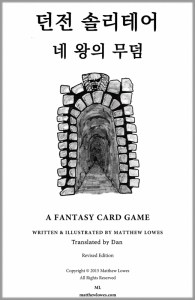 Ever since I posted the free print-and-play download for the first Dungeon Solitaire game, the dungeon has been expanding. And it’s been wonderful to hear from fans all over the world. A few fans have even offered translations into other languages. I’m super excited to announce we now have a Korean language edition of Dungeon Solitaire: Tomb of Four Kings. The translation by Dan looks fantastic and is ready for free download, print, and play.